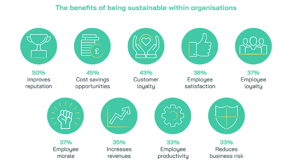 Organisations who seek to incorporate sustainable values into the business can expect to see wider benefits, with almost all (99%) reporting at least one benefit to being sustainable. Improved reputation (50%), opportunities for cost savings (45%), and increased customer loyalty and retention (43%) are just a few of the experienced and perceived benefits to adopting a sustainable mindset in business. It’s clear that organisations are thinking of ways in which they can remain relevant and appeal to their customer base, whilst making improvements both externally as a brand, and internally with their own employees.