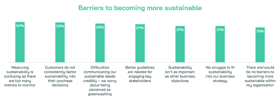 Organisations may however be underestimating their current efforts in implementing sustainable practices. The leading barrier to becoming more sustainable within their organisation is its ability to be measured effectively, with around a third (34%) reporting too many metrics to monitor. A further 29% stated difficulties in communicating their sustainable deeds credibly, with a fear of being perceived as greenwashing.