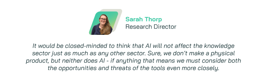 - Automating the mundane – AI handles the necessary but dull tasks, freeing us up to solve clients’ research problems