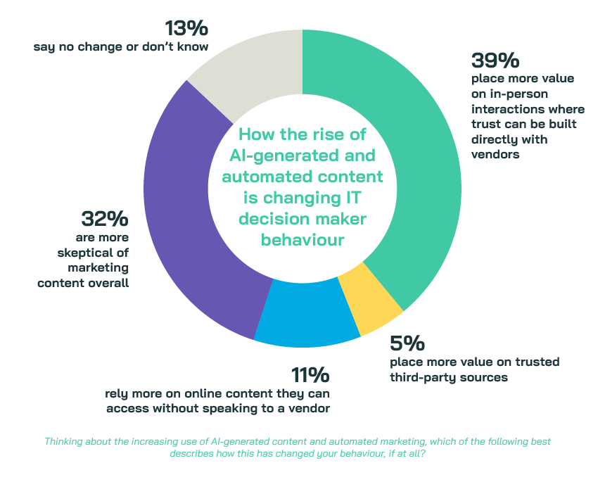 We spoke to 100 IT and technology decision makers in the UK about this and what we’ve found is that as buying journeys become more automated, trust is becoming harder to earn. In an upcoming report we found that AI is being used more to build awareness or understanding of a brand (going live soon!). This month in our Signals research, we found that with the increasing use of AI-generated content and automated marketing, one in three (32%) are more sceptical of marketing content.