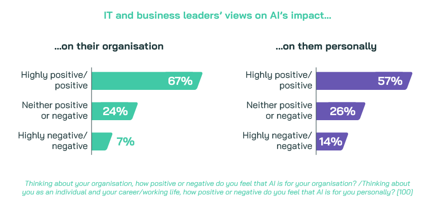 From the findings, while most IT and business leaders we surveyed see AI positively (see the charts below), the uncertainties start to show when we compare their view of the impact of AI on their organisation vs. its impact on them personally.