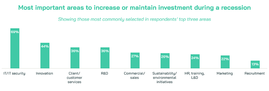 Well, more than a quarter (26%) of surveyed ITDMs cite sustainability/environmental initiatives among the top three most important areas to increase/maintain investment within during a recession. And while this leaves it lagging well behind areas such as IT/IT security (69%) and innovation (44%), it does compare favourably with HR, training, and learning and development (24%), marketing (22%), and recruitment (13%).