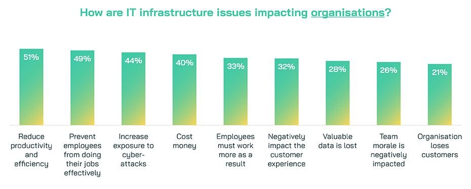 Such issues are not localised to the IT department and this is not just an IT problem, Almost all (99%) report that their IT infrastructure plays a role in their organisations’ overall success or performance, and the majority (75%) consider that role to be significant. Alongside a similar proportion reporting the same about their organisation’s wellbeing (69%), it is not surprising to see the level and variety of impact ITDMs cite. Of those who experience issues with their IT infrastructure – the vast majority (96%) of our respondents – a similar proportion (95%) report that they impact their organisation in some way.