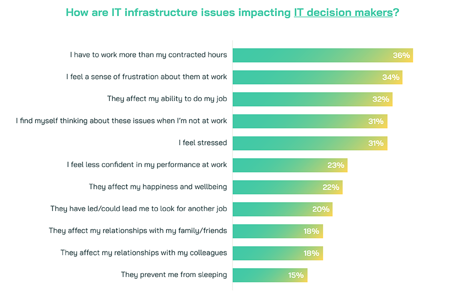 Such stark effects are also evident by the variety of ways respondents report their organisation’s IT infrastructure issues to impact them personally. Most likely are that they have to work more than their contracted hours and that they impact their emotions by feeling a sense of frustration about them at work, with more than a third of ITDMs reporting these consequences.