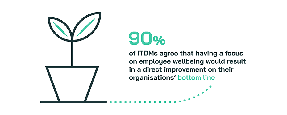 Organisations seeking excellence might be well placed to direct equal consideration of the health of their IT infrastructure towards employee wellbeing. Exactly 9 in 10 (90%) of those we interviewed agree that having a focus on employee wellbeing would result in a direct improvement on their organisations’ bottom line. A similar sentiment is reflected through the ranks from junior (88%) through to senior (94%) management, with almost nine in ten (87%) of those in c-level positions in agreement. And even lands across both sides of the pond, albeit with a slightly greater consensus forming in the US (92%) compared to the UK (86%).