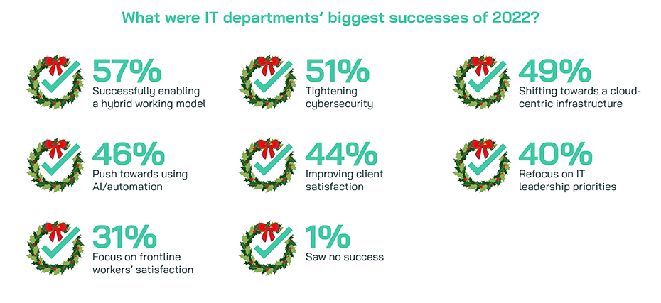 In 2022, the role played by the IT department in the on-going evolution (for many organisations) to a hybrid working model tops-the-tree of successes (57%). With the implementation of tightened cybersecurity practices (51%) and migration to cloud-based infrastructure (49%) being other of areas of triumph for a sizeable number of respondents.