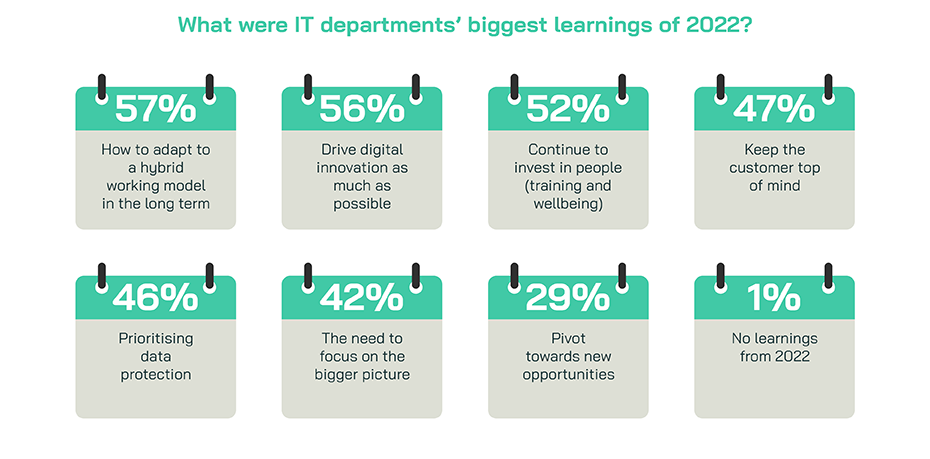 IT teams have not only achieved a number of successes this year, they have also gained some valuable insights. Much like in 2021, these include learning how to adapt to a long-term hybrid-working model (57%), as well as understanding how to most effectively catalyse digital innovation (56%). Although it didn’t quite make a Christmas number one, we did see a sizeable movement in the explicit acknowledgement of the importance of investing in people (52%, up from 45%) – emphasizing the importance of training (across both technical and ‘softer’ skills).