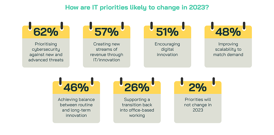 As many as 62% will prioritize cybersecurity against new and advanced threats; perhaps a key takeout from this report, is not to become complacent – cyber-criminals won’t stop, and nor should IT teams. We should also expect to see new streams of revenue being created through IT/innovation (57%) and better scalability to match demand (48%). What’s particularly pertinent here is that this shows a notable rise from 2022 priorities, up from 50% and 37% respectively.