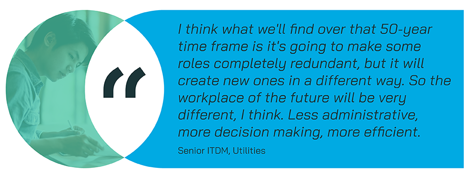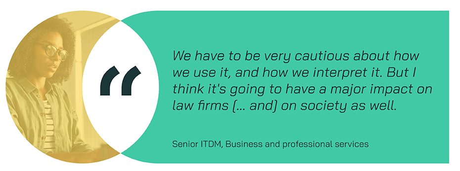 Currently, tools like ChatGPT are helping take out the mundane workloads in organisations, by compiling, generating, and checking documentation. In this way, potential time-savings are immense. One respondent we spoke to reflected on a task that would have taken 4-5 lawyers a whole week, being carried out by AI and machine learning technology in “probably 10 minutes”. Thinking again about the need for organisations to remain competitive, something that can not only save time but also adapt core business models, is worthy of serious investment.