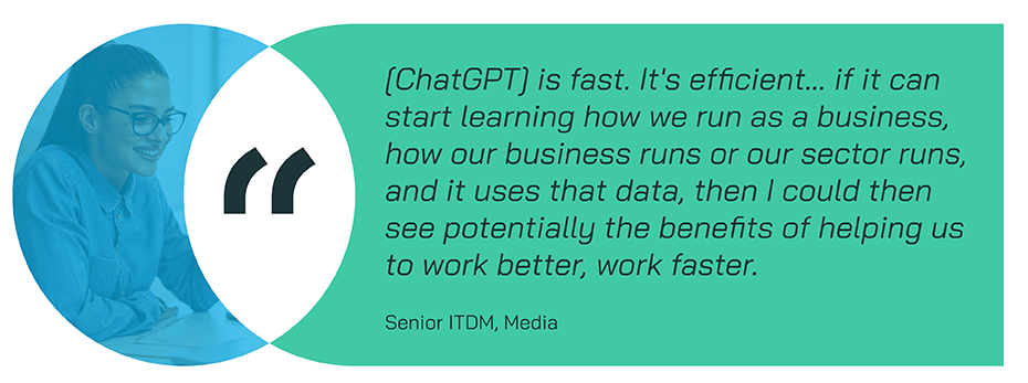 ITDMs are impressed by the potential for ChatGPT and similar AI platforms, and how it will shape the future, both in a personal and professional capacity. Thinking more specifically about business use cases, chatbots were singled out as something in use but that could be enhanced by further reducing the need for human intervention.