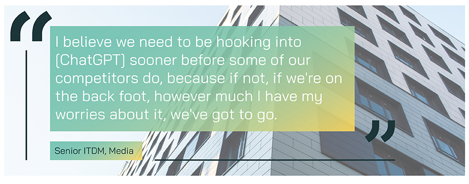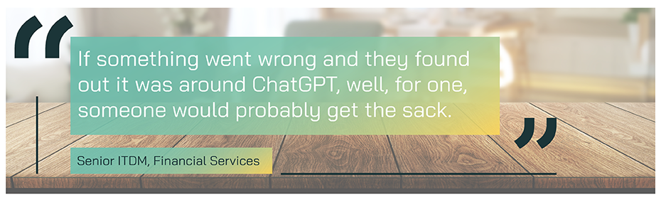 We wanted to find out how IT decision makers (ITDMs) feel about ChatGPT, both personally and professionally, so we conducted a handful of in-depth interviews with technology leaders from large companies in the UK to gain a rich understanding of their thoughts. Our interviews uncovered a mixture of approaches and attitudes: from companies jumping head-on into ChatGPT usage, to those who currently have banned its use on company devices.