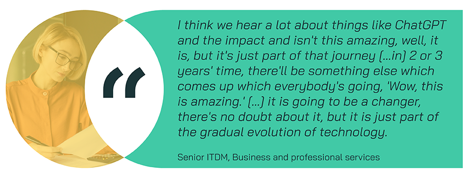 A lot of hype surrounds ChatGPT right now, but there is consensus among ITDMs that as other organisations rush to produce their own versions, it may well be overtaken. Microsoft 365 Copilot is one such product we’ve been advised to look out for. AI in a much broader sense is what ITDMs regard as important and while ChatGPT may be replaced by other tools, there is no indication that AI chatbots will be going away any time soon.